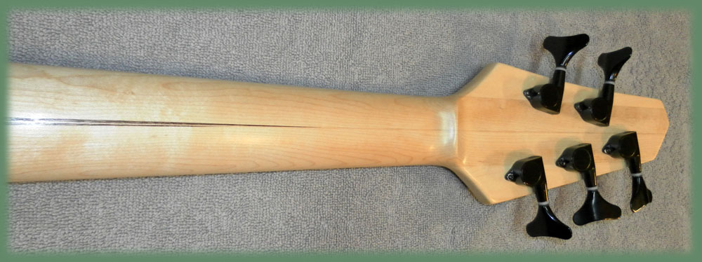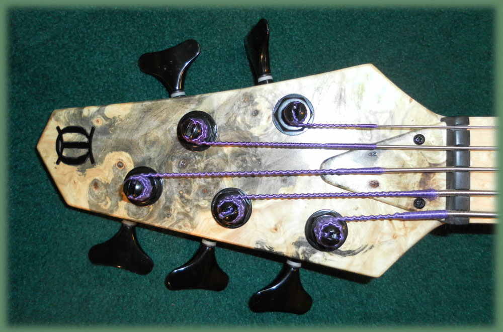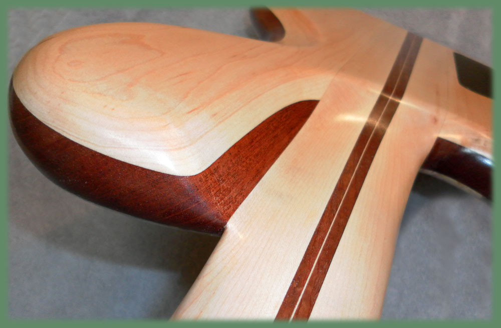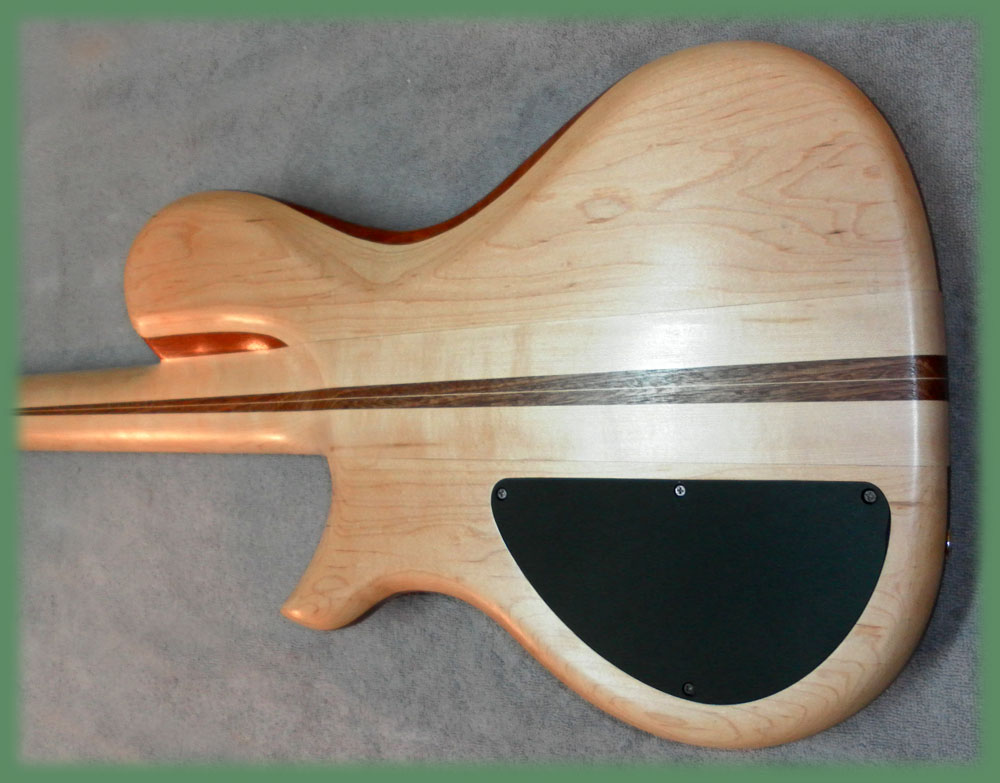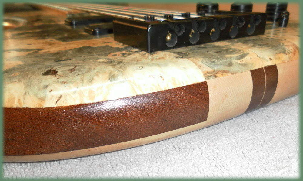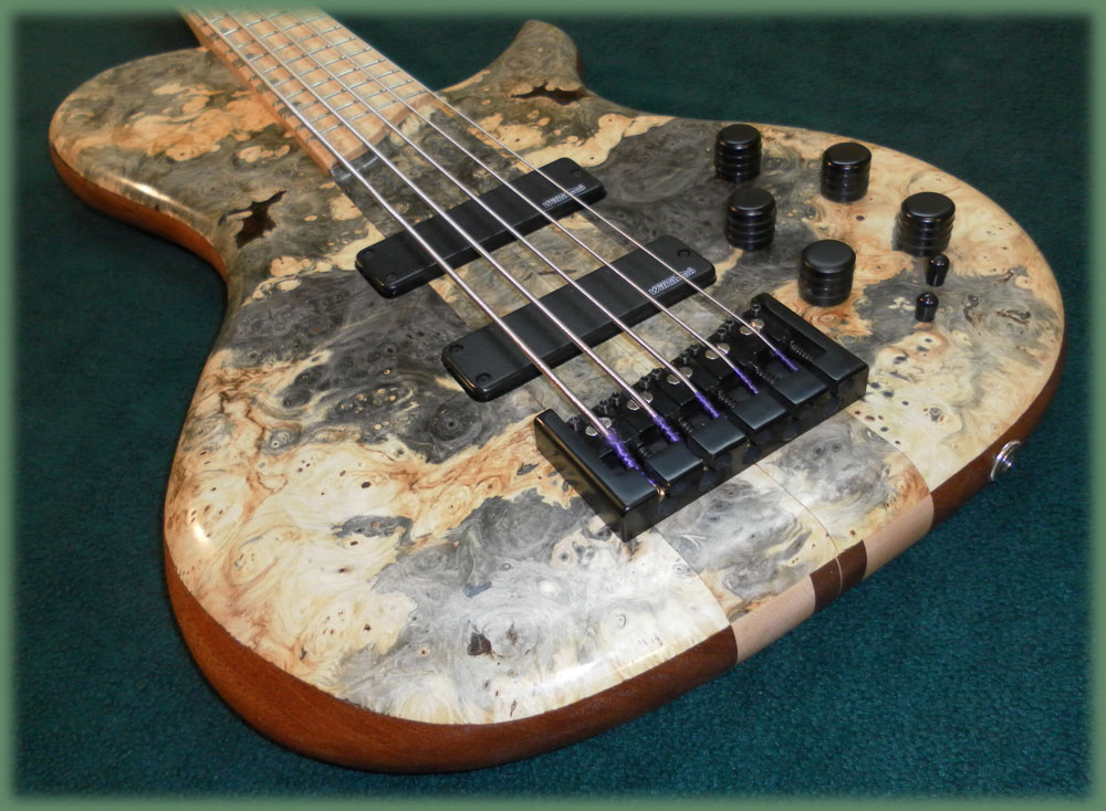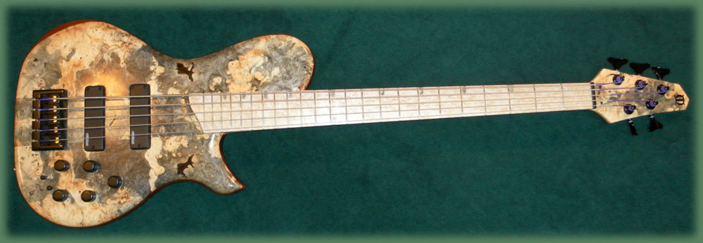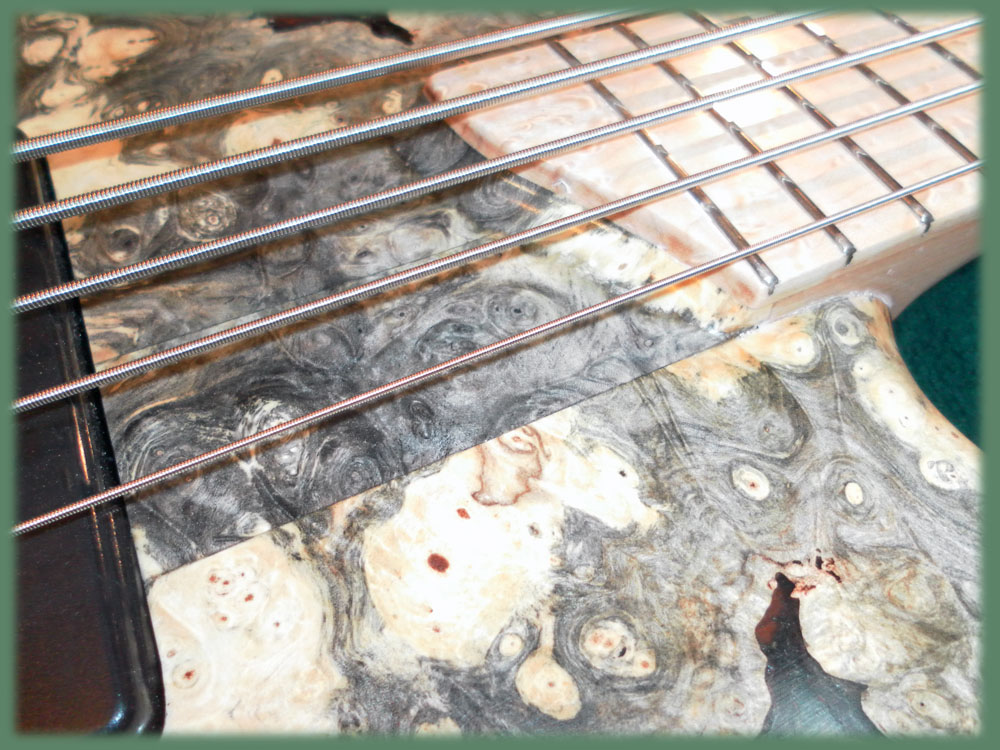 This bass features a really nice piece of Buckeye Burl for the top and matching headstock, which is where the name "Cosmic Storm" came from. The center core is mahogany with a maple back laminate. The neck is a five piece lamination of maple and sapele. The center laminations taper from the bottom of the bass on through until they disappear a little over two-thirds of the way up the neck. It has an oil finish, black hardware and unique electronics setup.