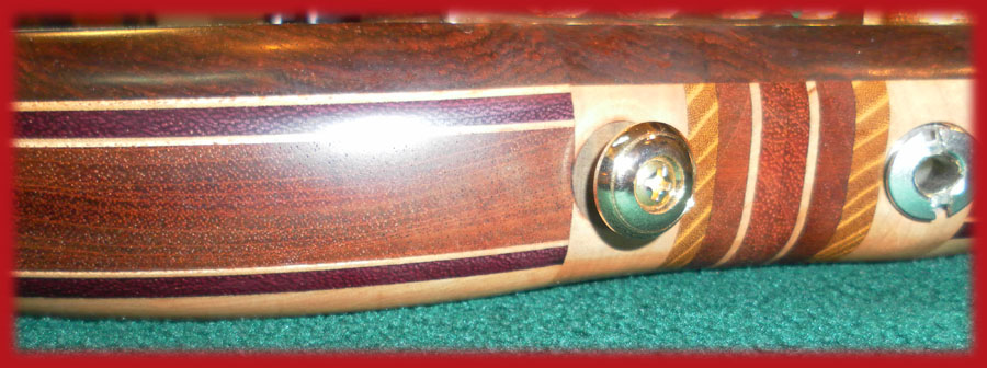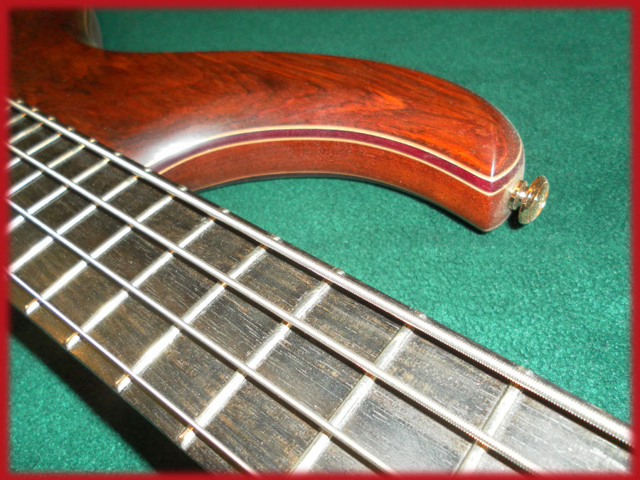 This bass has somewhat of a unique history. The Cocobolo used for the top had been laying around my shop for almost 10 years. I had purchased it because it had an interesting grain pattern that I thought would make a nice project of some sort. I had no intentions for using it in a bass at the time. It was 2009 before I decided to build a bass with it. When I had finished it I chose to keep it for myself.