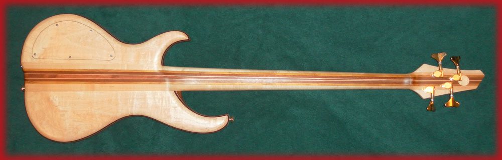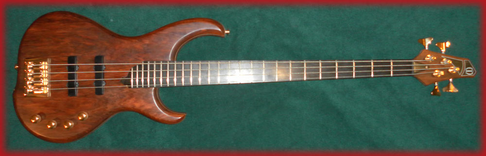 Cocobolo top with a mahogany core separated by layers of purpleheart and maple for the body with a maple back. The headstock also has laminations of maple and purpleheart. The neck has 10 laminations consisting of maple, mahogany, osage orange and brazilian rosewood. The Miller logo is ivory made from old piano keys. It is set in Gaboon ebony which comes from the same piece as the fingerboard. The bass is finished in tung oil.