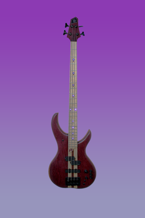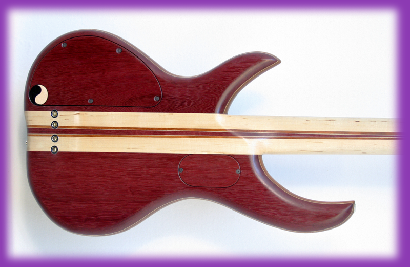 Body has 5-laminates which consists of a Mahogany core with a super thin layer of maple on each side and finally a Purpleheart top and bottom laminate.