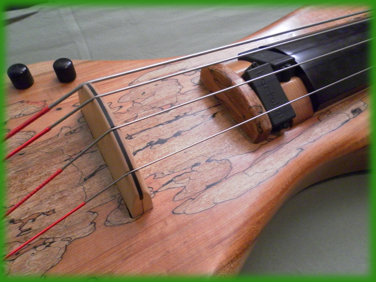 Spalted Thunder was an interesting project to say the least. Andrew came to me through a friend of mine I had built a bass for about a year prior. Andrew had specific design ideas in mind and we worked together to make sure that he was happy throughout the building process. Over the next few weeks and many design tweaks later, we finally were able to settle on a design we both thought would give the look and hopefully the sound he was trying to achieve. The sound that we were attaining to accomplish was an acoustic upright. The hours put into Spalted Thunder has proven to be very satisfactory, not only to the eyes but also to the ear. As it turns out, in the end, Andrew was very pleased with not only the looks but also the sound of the instrument. The acoustic sound we were trying for has proven itself in the end. The combination of many qualities has given this instrument a unique depth of character.