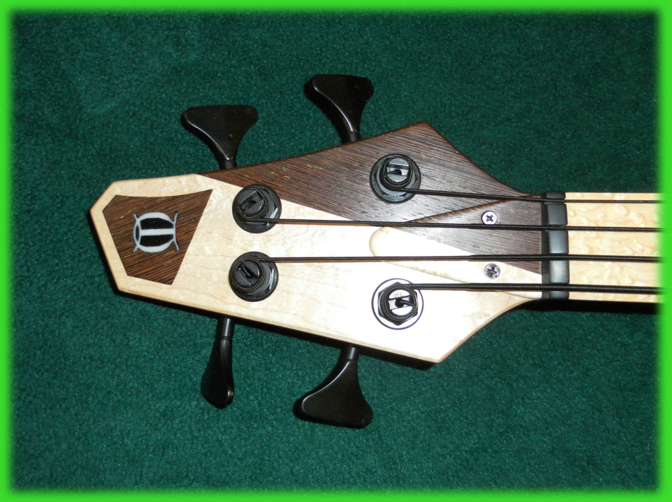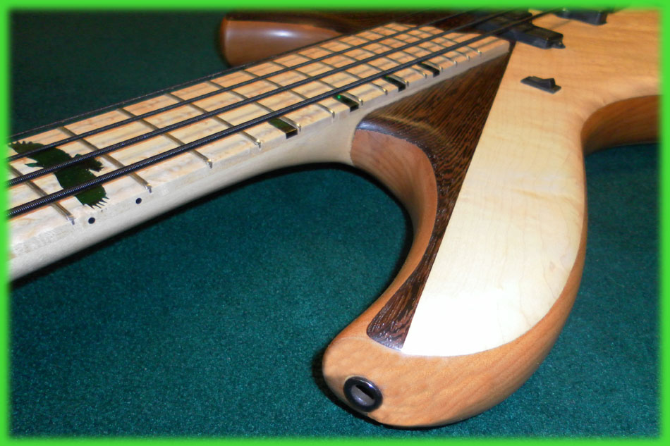 This bass has a few unique features. First off is the green top/side LED position markers. They are set into the neck so that they are able to be seen from the front and side as can be seen in the pictures. At the 12th fret there is an eagle with Jeff's initials. There are LED's that light his initials also but they cannot be seen when the lights are off. The top and matching headstock are a combination of maple and wenge. The back is maple with a matching wood electronics cover. It is cut from the same piece as the back before it is glued to the core. This keeps the grain consistent throughout the entire back piece. The center part of the body is made of alder. The neck is made from maple and purpleheart laminations. The finish is tung oil.