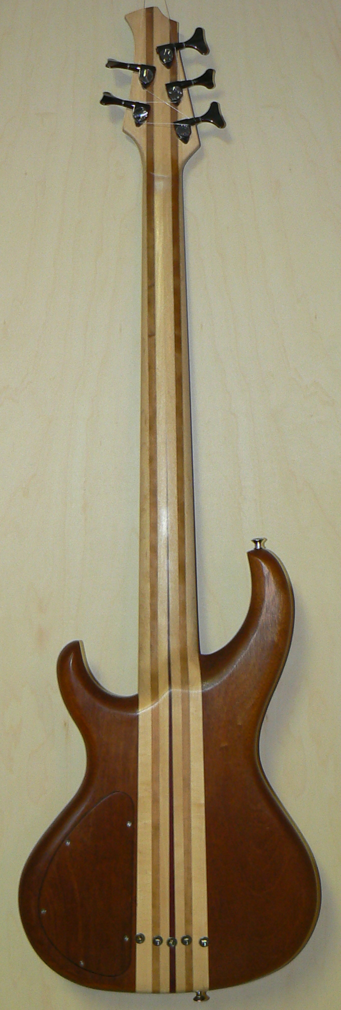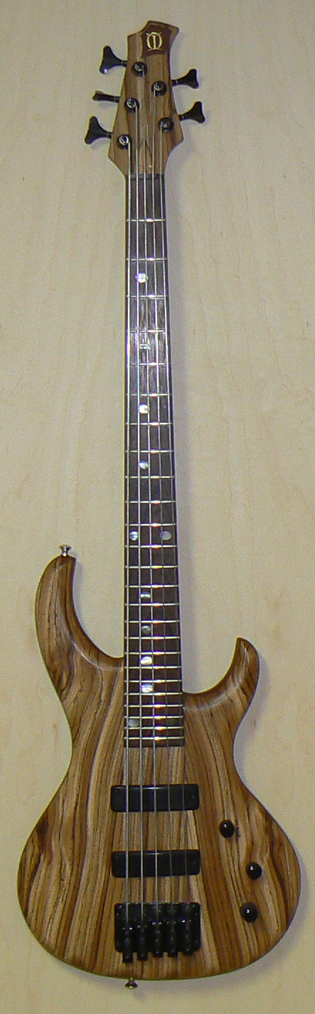 This bass was built a few years ago while I was living in Anchorage, AK. I had a piece of really nice looking Zebrawood that had been laying around and decided it was time to build something out of it. I chose to build a five string bass. It has a solid mahogany back and a wenge fretboard with black mother-of-pearl ovals for position markers. The neck is quite unique. It has four maple laminates, two cherry and a center laminate of purpleheart. The unique part is that the center laminate of purpleheart tapers from 3/8 of an inch at the bottom of the neck until it disappears just about halfway up the neck.
