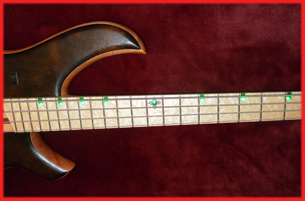 The body core is made of African mahogany with an accent layer of hard maple. The neck consists of hard maple and purpleheart with the center laminate being curly maple. The fretboard is birdseye maple with top/side LED markers and an inlay of the "Zia" sun on the 12th fret. Luke had his initials inlaid into the backside of the headstock which mad for a truly custom setup.